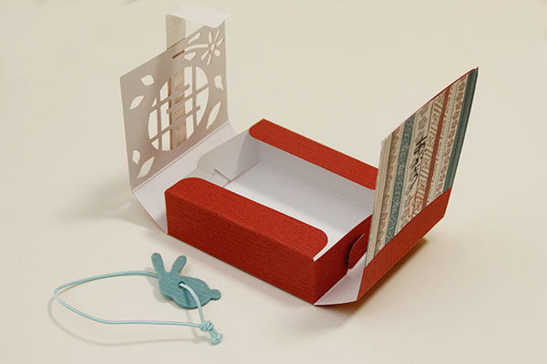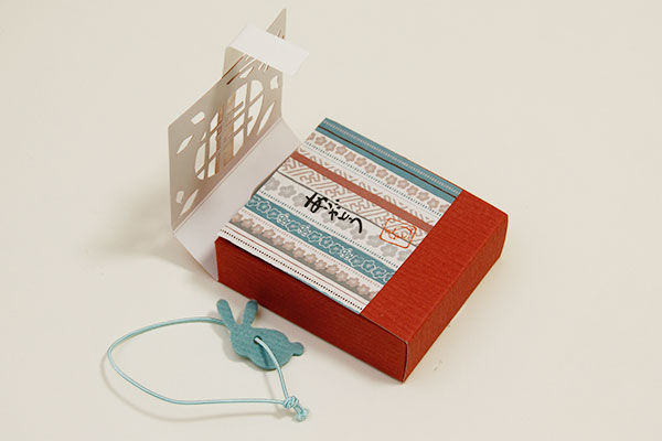 箱の作りがとても凝っていて、箱全体をゴム+うさぎシルエットのフェルトと、紙で巻いてあります。
