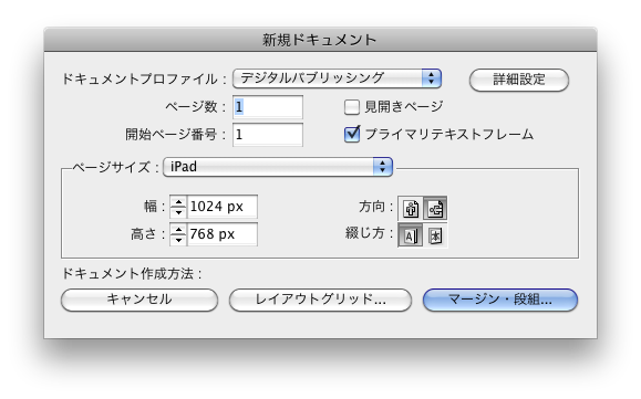 2)ターゲットデバイスや、縦横、表紙などを設定します。