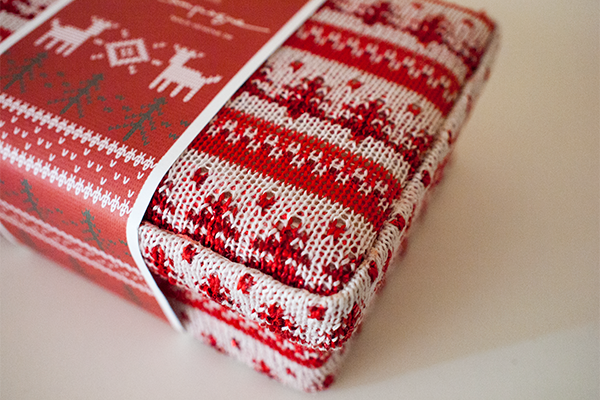 上下かぶせ箱に紙の帯がついているものなのですが、箱がニット!