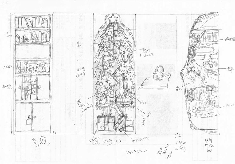その中からさらに思考をまとめていって、最終的に上がってきたのが、本棚のイラスト、クリスマスツリー、読むという行為を中の小さな人が消化するものでした。